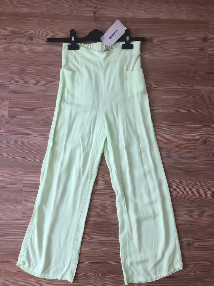 Sıfır etiketli ürün.Kızıma beli bol geldiği için giyinemedi.Yeşil renkte, pastel tonlu, bol kesim ve uzun boy kumaş pantolon. Yumuşak sentetik kumaştan üretilmiş, trend günlük ve açık hava için uygun.