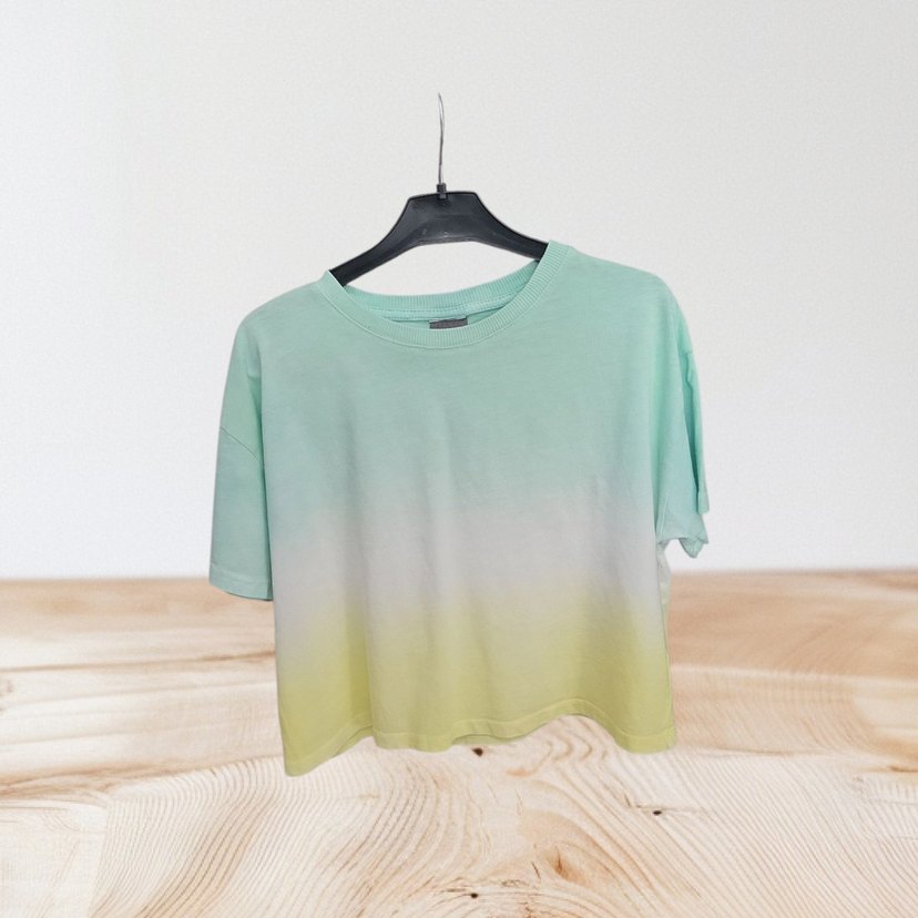 Pamuklu, gevşek kesim, pastel yeşil tie-dye desenli kadın tişörtü. Kısa kollu ve yuvarlak yakalı, günlük kullanıma uygun rahat bir model.