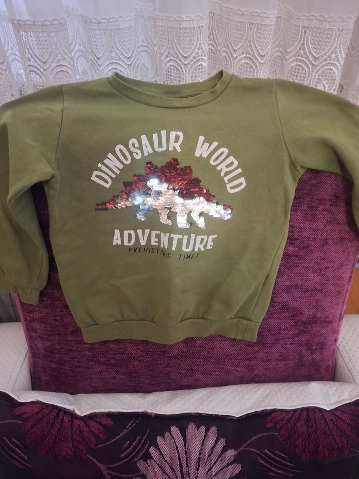 Çocuklar için uzun kollu, yuvarlak yaka ve bol kesim sweatshirt. Yumuşak ve sıcak kumaştan, renkli dinozor baskısı ve payetli detaylarla, "Adventure" ve "World" yazılı.yeniden farksızdır sadece ütüsüz