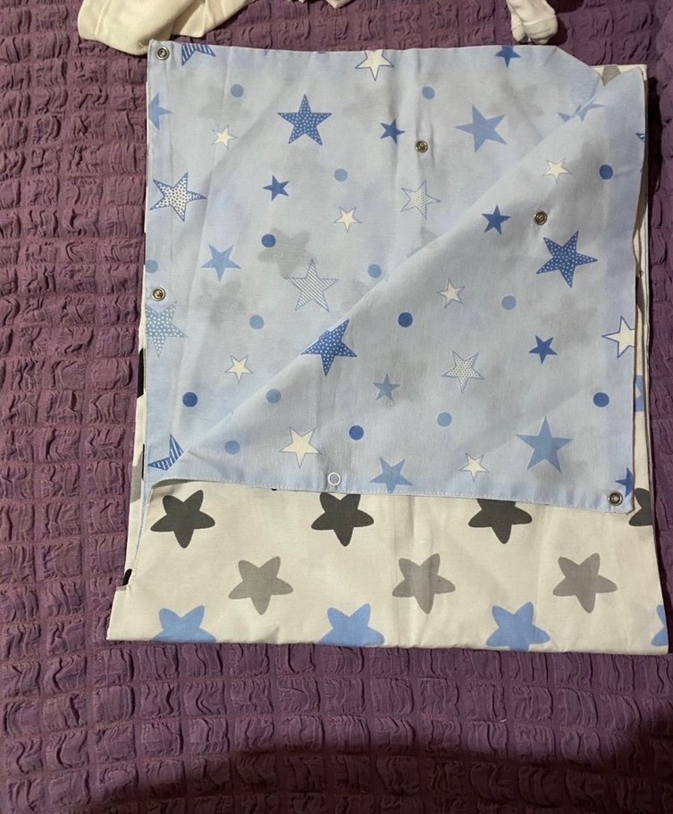 Çocuklar için mavi ve gri tonlarda yıldız desenli, yumuşak sentetik kumaştan yapılmış puset örtüsü. Kolay kullanım için çıtçıt düğmeler içerir.