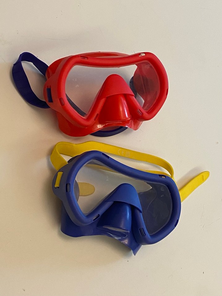 Renkli ve elastik bantlı, kısa boylu yüzücü maskeleri. Minimalist ve pop kültür tarzında, plaj için uygun.