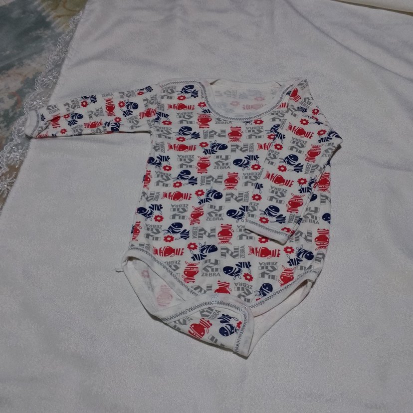 Beyaz renkli, uzun kollu kız bebek body, renkli desenlere sahip ve yumuşak örgü kumaştan üretilmiştir. Yuvarlak yaka detaylıdır.