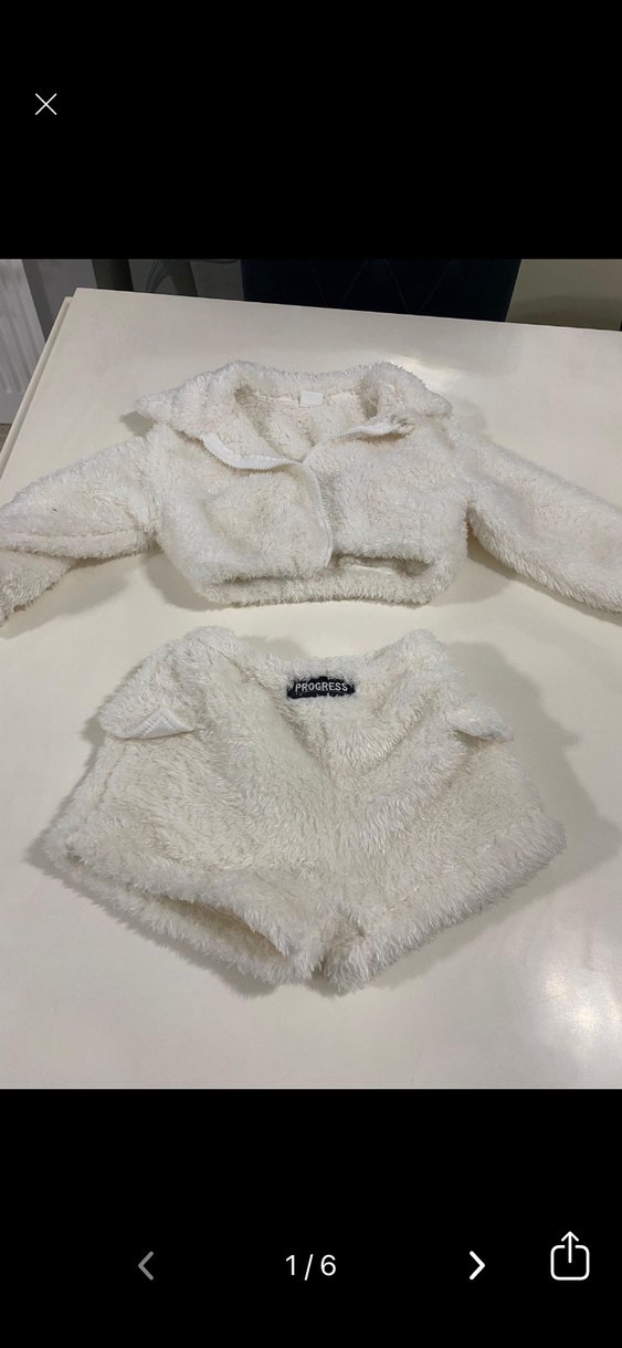 Çocukiçin beyaz peluş kumaştan, uzun kollu kısa ceket ve mini şort seti. Desensiz, rahat ve sokak tarzına uygun bir tasarımdır.