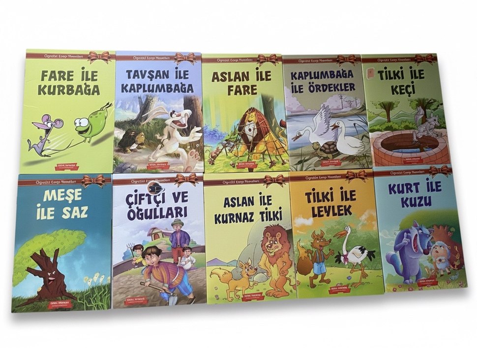 Tavşan ile Kaplumbağa, Aslan ile Fare, Tilki ile Leylek gibi 10 klasik hayvan masalını içeren çocuk kitapları seti. Yırtık vs yoktur. Sıfır ayarında. Sayfaları eksiksizdir.