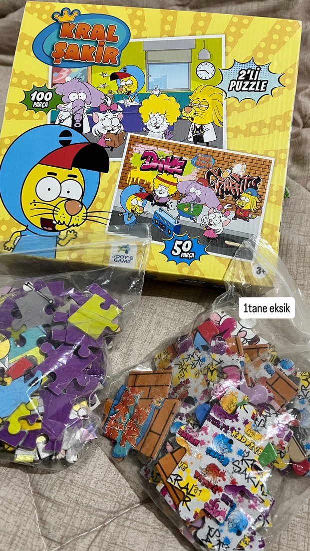 Renkli 2'li puzzle seti, 100 ve 50 parçadan oluşur. Setten bir parça eksiktir. 3 yaş ve üzeri çocuklar için uygundur.