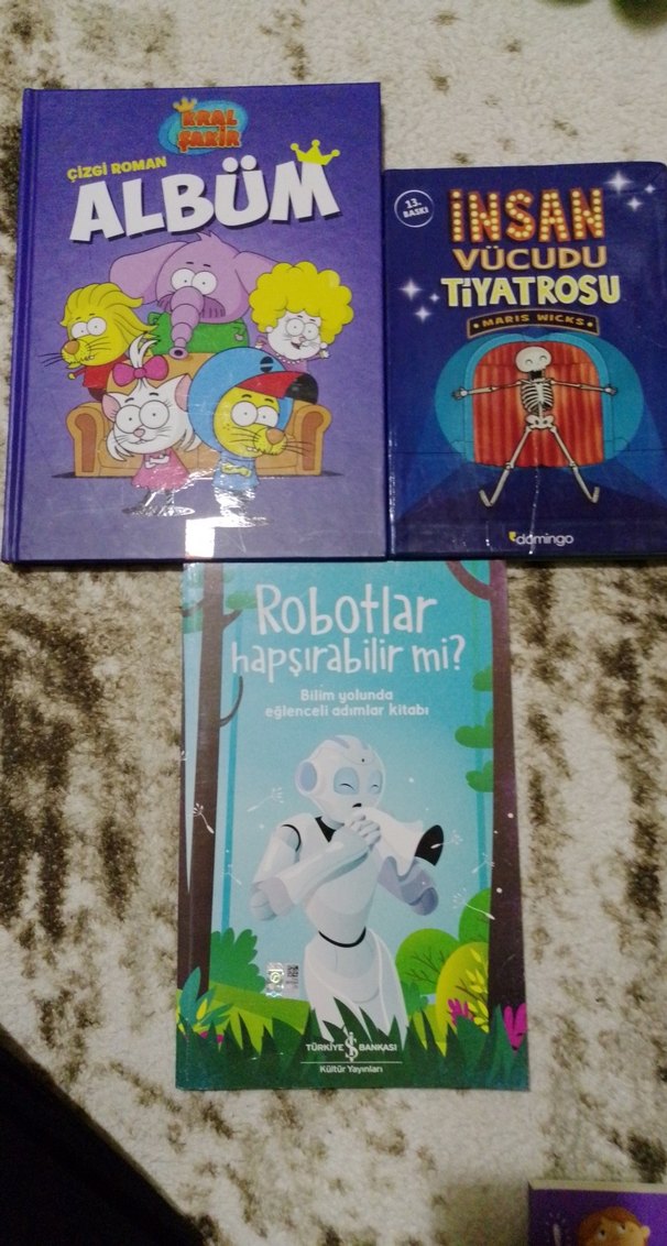 Çizgi roman albüm, insan vücudu tiyatrosu ve robotların hapşırmasını anlatan bilim kitabı içeren 3 eğitici çocuk kitabı seti.