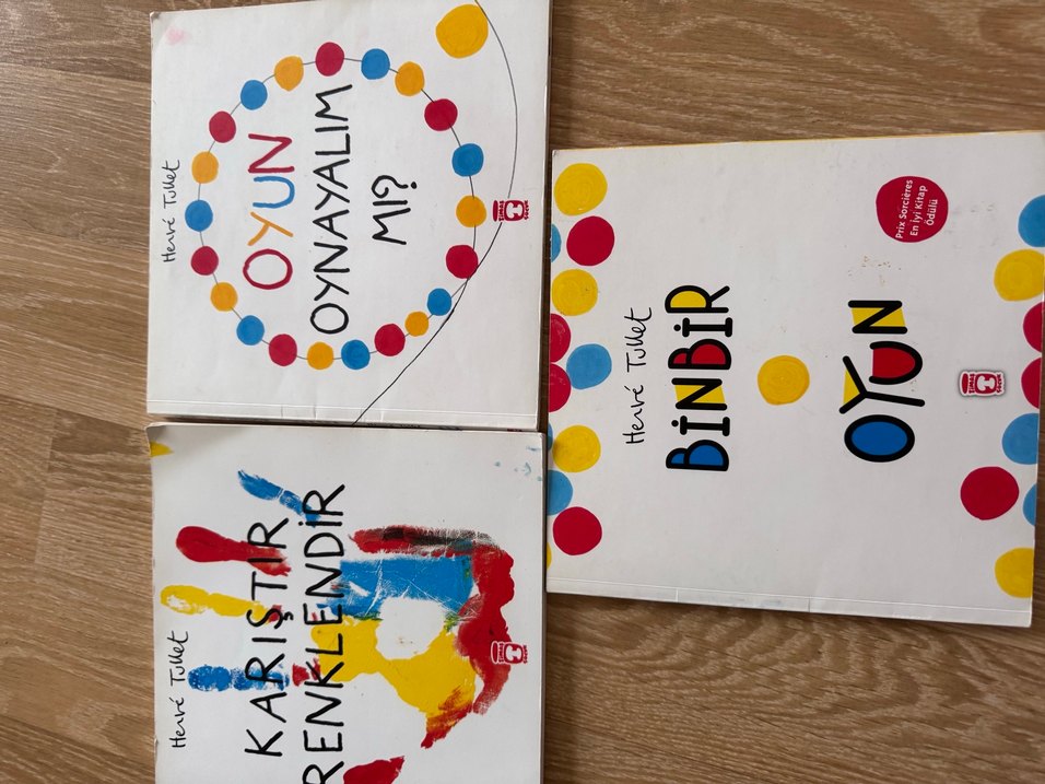 Renkli ve eğlenceli tasarımlı üç çocuk kitabı seti. "Oyun Oynayalım mı?", "Karışık Renklerdir" ve Henri Tulet'in "Binbir" kitaplarını içerir.
