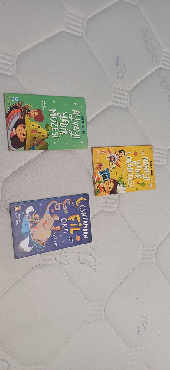 Üç eğlenceli çocuk kitabı seti, renkli çizimler ve macera dolu hikayeler içerir. 'Çantamdan Çıktı Fil' ve 'Nane'nin Yedik Lokantası' ve Ayvayı Yedik Muzesi gibi kitaplar bulunur.