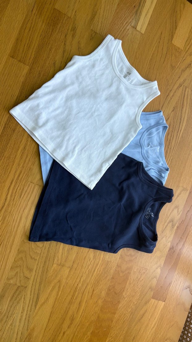 Beyaz, açık mavi ve koyu mavi renklerde üçlü çocuklar için pamuklu atlet seti, yumuşak ve rahat kumaştan üretilmiştir.