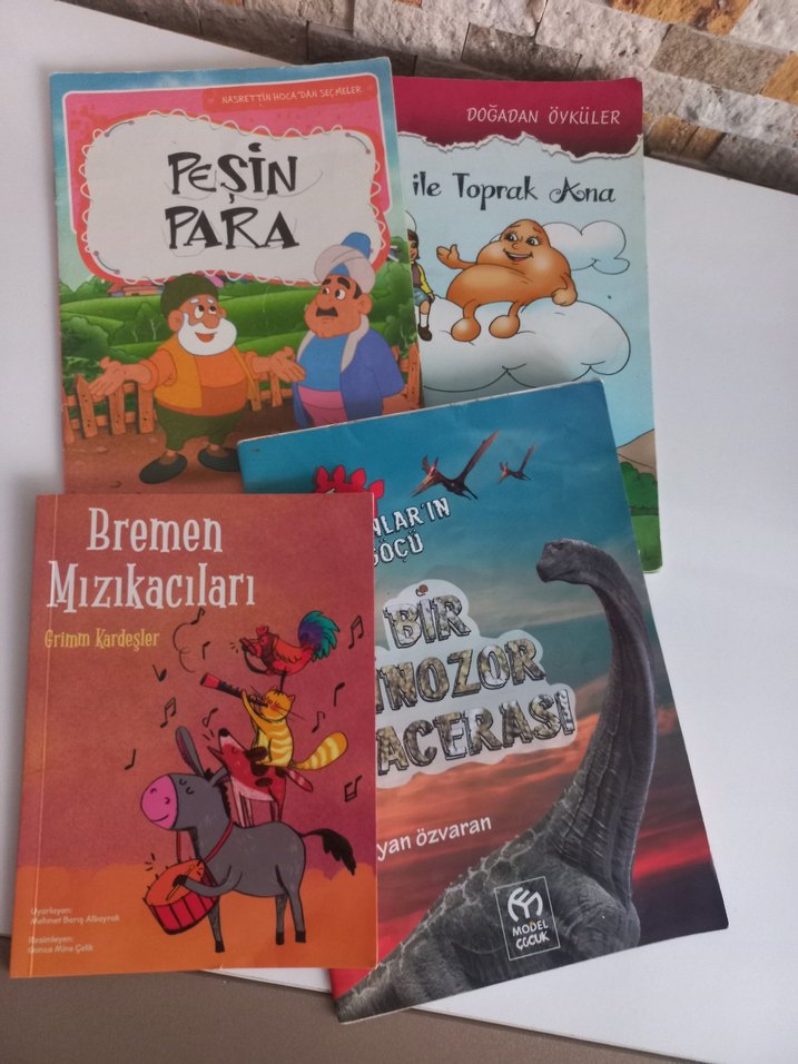"Peşin Para," "İle Toprak Ana," "Bremen Mızıkacıları" ve "Bir Dinozor Macerası" adlı dört çocuk kitabı seti.