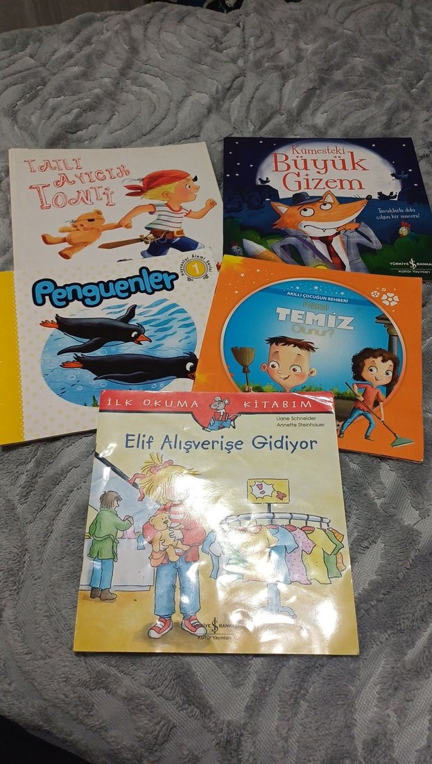 "Penguenler," "Büyük Gizem," "Temiz" ve "Elif Alışverişe Gidiyor" adlı erken okuma kitaplarını içeren 4 kitaplık çocuk seti.