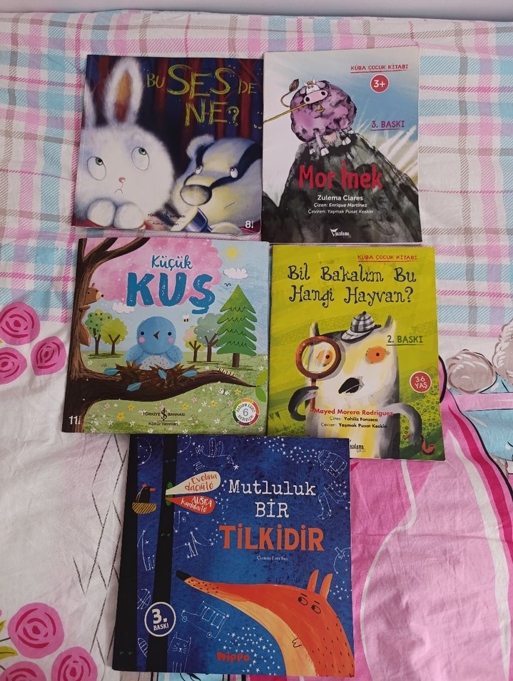 3 yaş ve üzeri çocuklar için hayvan temalı beş renkli kitap seti. Mutluluk, küçük kuş ve hayvanları tanıma hikayeleri içerir. sorunsuz