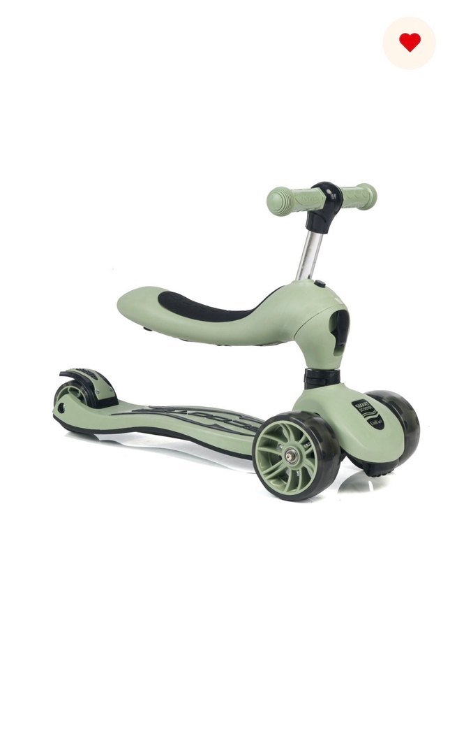 Çocuklar için açık haki renkte, sağlam gövde ve rahat tutacaklara sahip scooter. Dengeli sürüş için üç tekerlekli ve geniş ayak desteği bulunur.