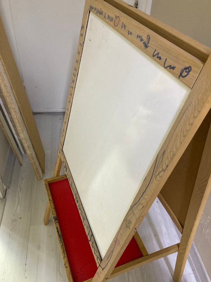 Ahşap çerçeveli, beyaz yazı tahtası ve alt kısmında kırmızı saklama rafı bulunan çocuklar için yazı tahtası. ️