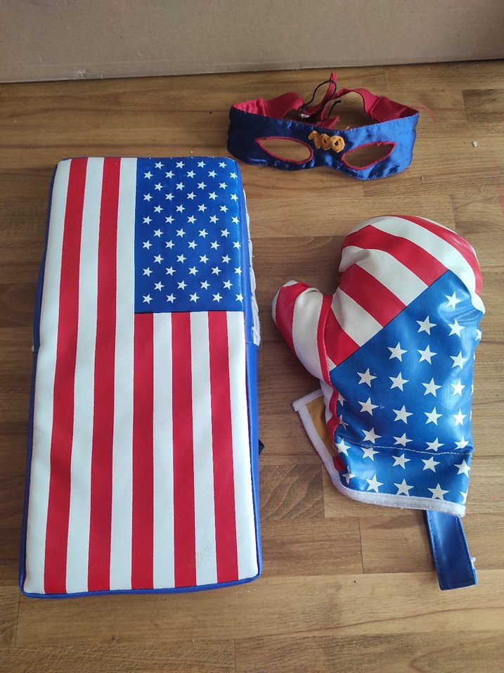 Amerikan bayrağı desenli, renkli çocuk boks eldiveni, minderi ve maske seti. Sentetik kumaştan, cırt cırtlı kapanışlı. 2 eldiven var