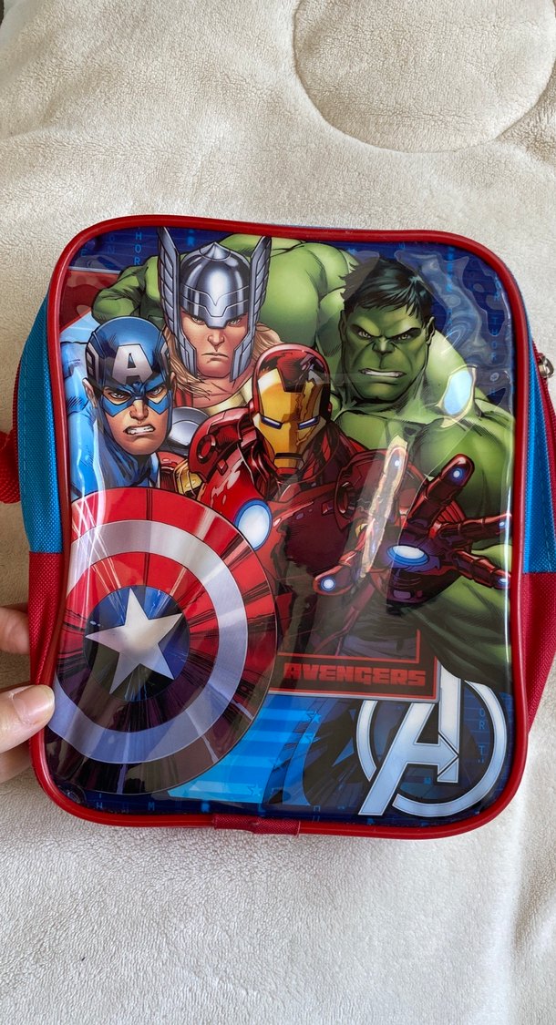 Çocuklar için Avengers karakterli, çok renkli ve koyu arka planlı beslenme çantası. ️