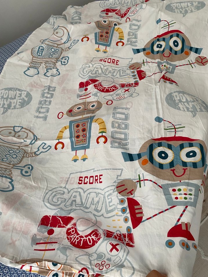 Çocuklar için gri ve çok renkli baskılı robot desenli, "SCORE" yazılı yumuşak kumaştan tekstil ürünü.
