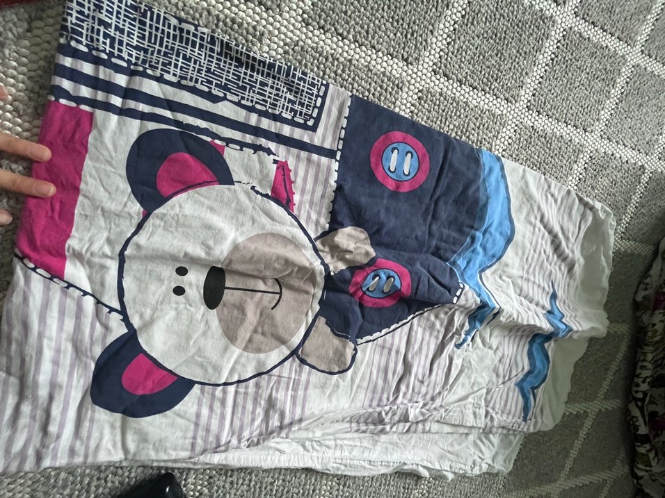 Çocuklar için ayı figürlü baskılı, gri ve çok renkli uyku örtüsü. Yumuşak sentetik kumaştan üretilmiştir.