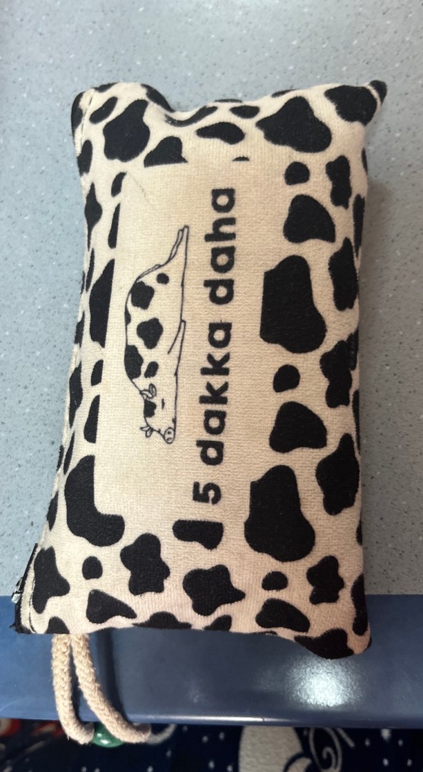 Koyu kamel rengi, baskılı desenli ve yumuşak dokulu çocuk yastığı. Üzerinde eğlenceli çizim ve Türkçe yazı bulunur.