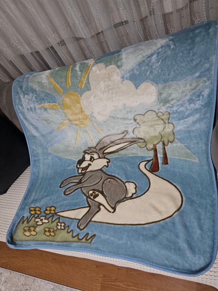 Yumuşak ve sıcak dokulu bu çocuk battaniyesi, mavi zemin üzerinde tavşan, güneş ve ağaç desenleriyle renkli baskıya sahiptir.