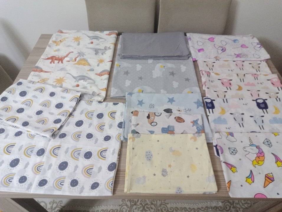 Yumuşak tekstil malzemeden, çeşitli gri tonlarda ve yıldız, hayvan, gökkuşağı gibi desenlere sahip çocuklar için baskılı uyku tekstili.