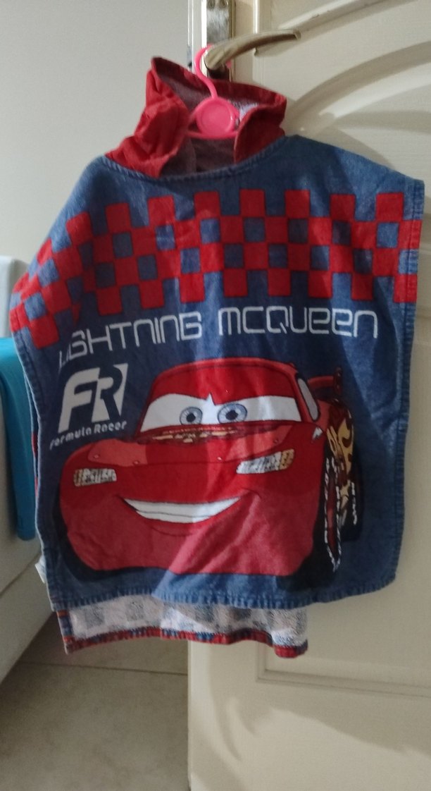 Kapüşonlu, renkli ve baskılı Lightning McQueen desenli çocuk bornozu. Kırmızı ve mavi tonlarıyla dikkat çeker. 'R' harfi tasarımda yer alır.