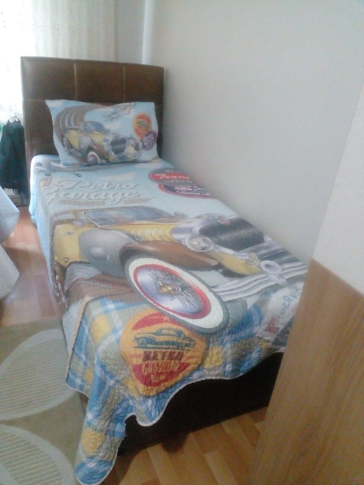 Çocuklar için baskılı, gri renkte sentetik kumaştan yatak çarşafı ve örtüsü. Yatağa renkli ve eğlenceli bir görünüm kazandırır. ️