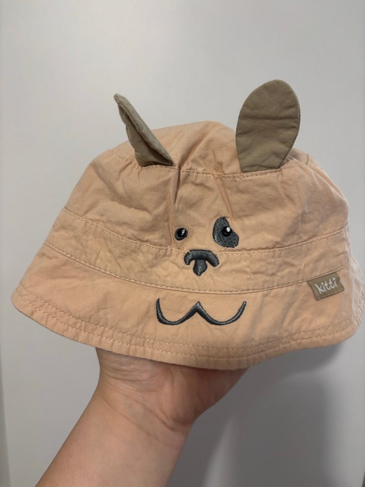 Bej renkte, kulaklı ve nakışlı kedi yüzü detaylı çocuk kova şapka. Sentetik kumaştan, trend sokak stili için uygun.