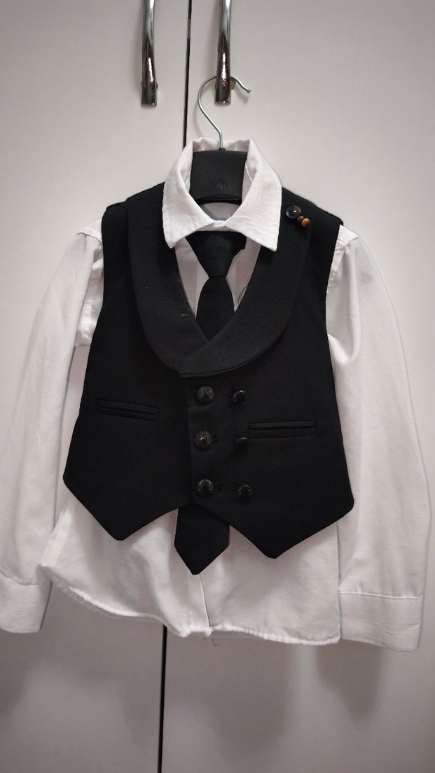 Çocuklar için beyaz uzun kollu gömlek, siyah düğmeli yelek pantolon ve kravat içerir. Yelekte kesik yaka bulunur, klasik normal kesimdir. pantolon paçaları orjinal olup işlem uygulanmamıştır 1-2 yaş erkek çocukları için idealdir. 1 defa düğünde kullanıldı.