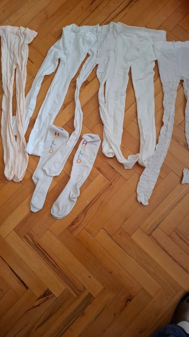 Beyaz keten kumaştan, desensiz çocuk külotlu çoraplar. Bir çiftin ayak kısmında renkli 'HELLO' yazısı bulunur. Hepsinin fiyatıdır. Sıfır ayarındadır 4_5 yaş