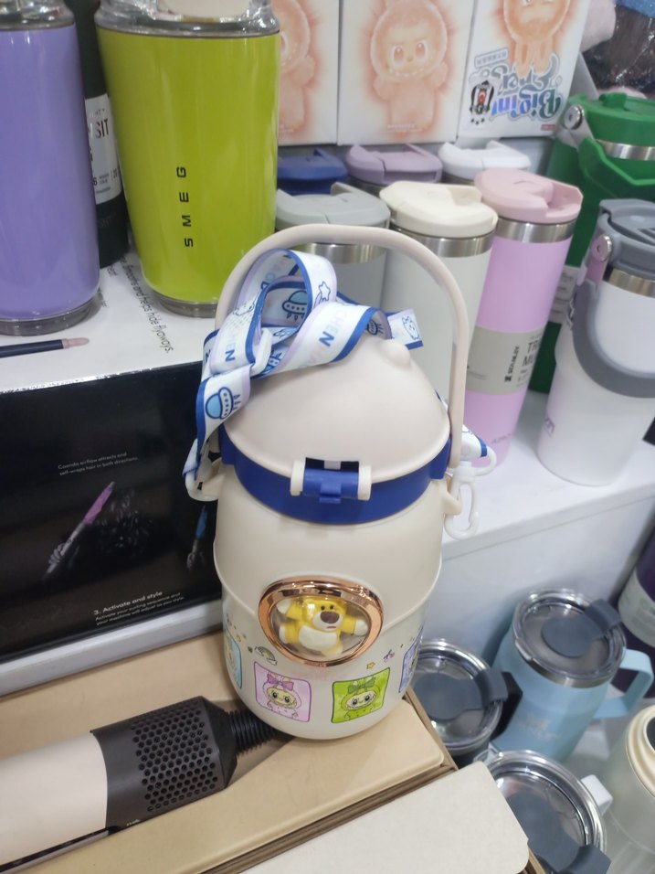 Çocuklar için beyaz termos şişe, güvenli kapak ve taşıma sapı içerir. Renkli çizgi film stickerları ve mavi taşıma kayışı vardır.