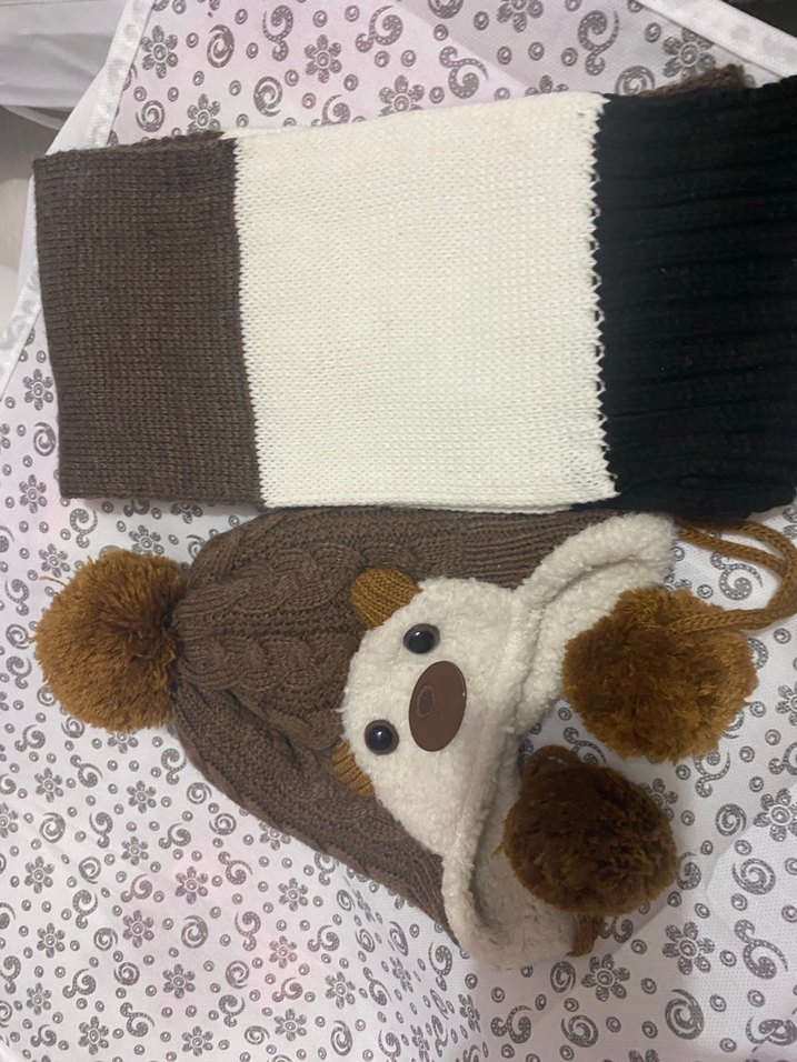 Oyuncu ayı yüzü ve ponponlu kahverengi örgü bere ile gri, beyaz ve siyah renk bloklu atkı seti. Çocuklar için rahat ve bohem tarz. Olmadı kullanamadık