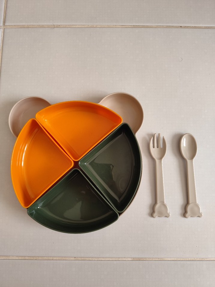 Çocuklar için koyu turuncu ve yeşil tonlarında bölmeli tabak, pati şeklinde saplı çatal ve kaşık seti.