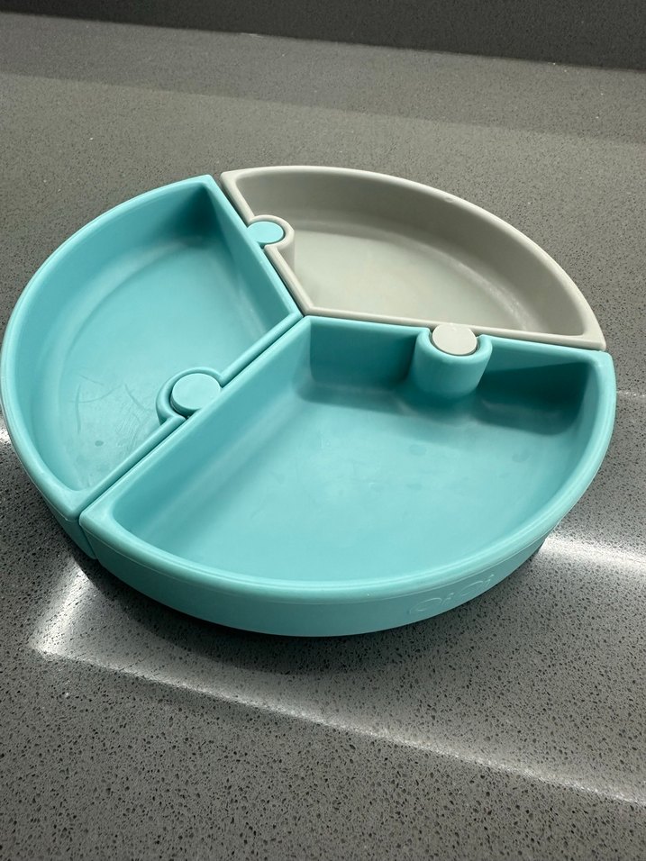 Bu çocuk tabak seti, yiyecekleri ayırmak için birbirine geçen mavi ve gri üç bölümden oluşur. Dayanıklı malzemeden yapılmıştır. Az ve sağlam kullanıldı. Vakumludur kokma leke bırakma yapmaz .