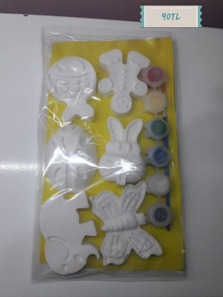 Çocuklar için beyaz hayvan figürlü kalıplar ve altı küçük boya kabı içeren boyama seti. Sarı zeminli ambalajda, fiyatı 90TL.