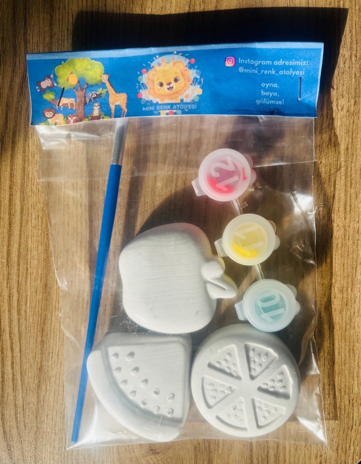 Elma, karpuz dilimi ve pizza şeklinde beyaz objeler, üç boya ve fırça ile boyanmak üzere set halinde sunulmuştur.