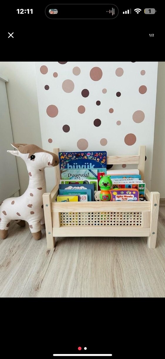 Örgü detaylı ön paneliyle açık camel renginde, çocuk kitapları ve oyuncakları için raf.