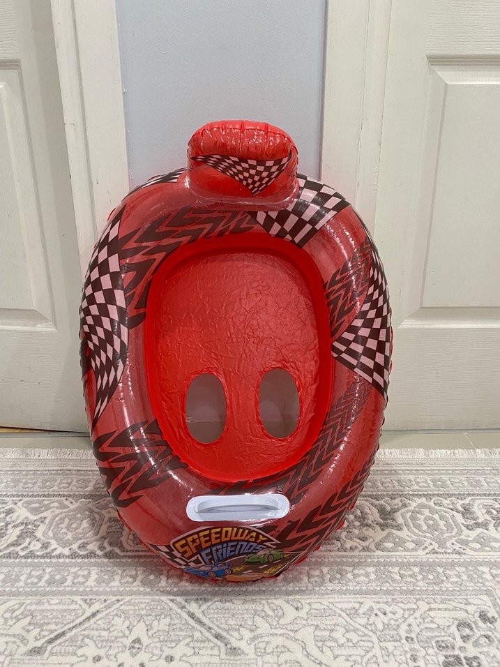 Çocuklar için iki ayak deliği ve sırt dayanağı olan renkli kırmızı şişme deniz aracı.