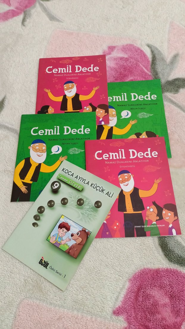 Cemil Dede'nin namazı anlatan kitapları ile Koca Ayı ve Küçük Ali hikayesi içeren çocuk kitapları seti. Renkli çizimlere sahip.