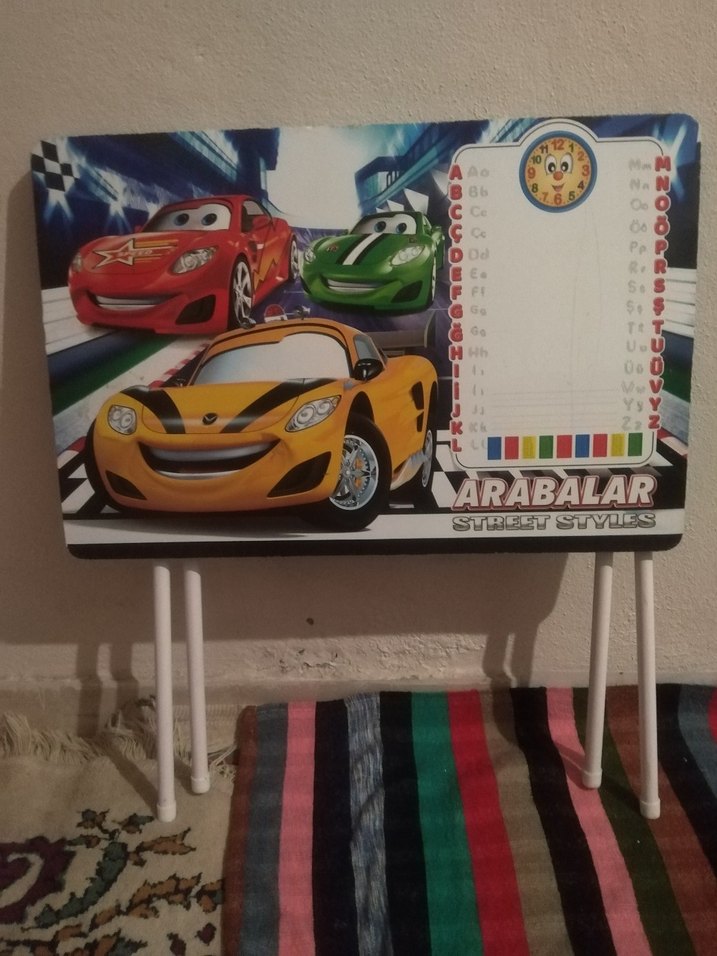 Çocuklar için çok renkli, arabalar temalı, masa. Alfabe ve saat çizelgesi içerir, çocuk odaları için uygundur.