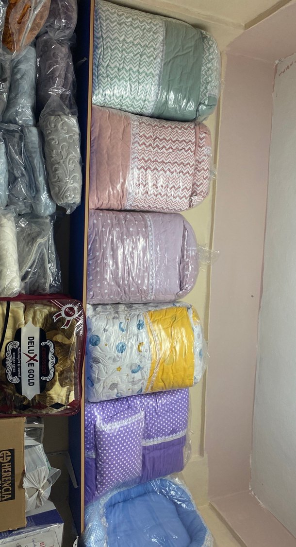 Pastel tonlarda, bağlama desenli ve çeşitli desenlere sahip çocuk uyku tekstili ürünleri. DELUEGOLD markalı ambalajlar dikkat çekiyor. ️çocuk yatak takımı çarşaf yastik yorgan döşek