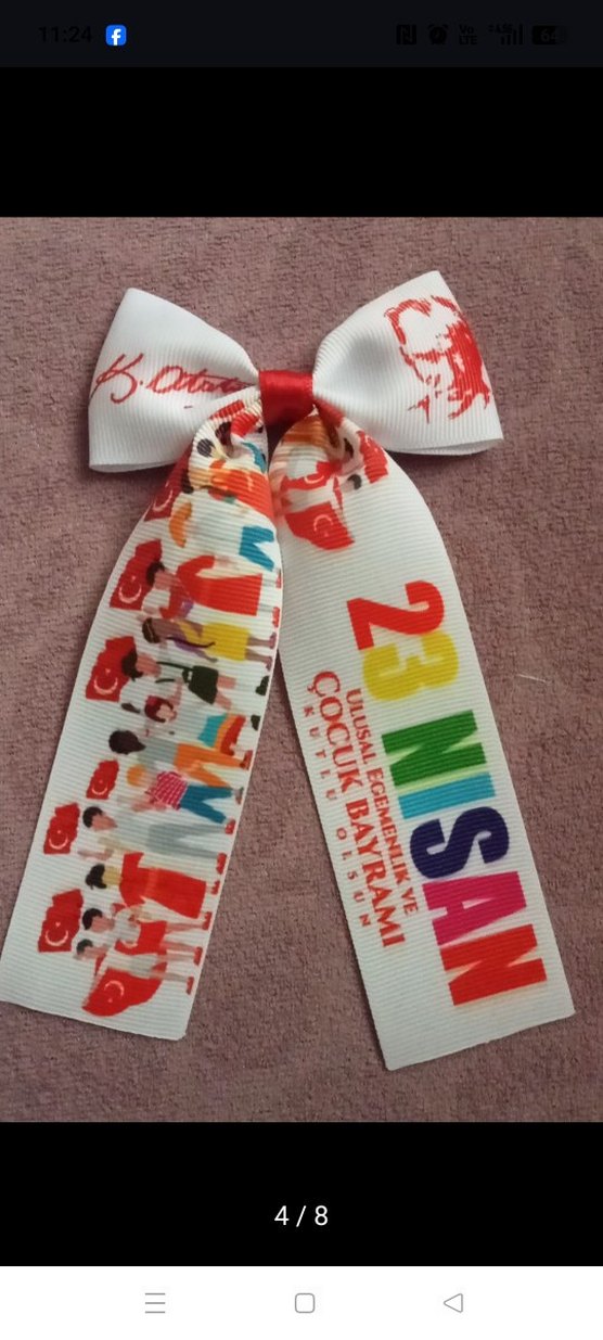 Çocuklar için çok renkli baskılı, kurdele şeklinde saç tokası. "23 NİSAN" yazılı ve patriotik desenlere sahip, yumuşak kumaştan yapılmıştır.