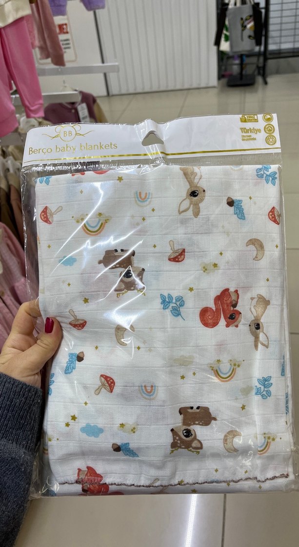 Yumuşak sentetik kumaştan yapılmış, sevimli baskılı hayvan desenlerine sahip çok renkli çocuk battaniyesi. Paket üzerinde "Berco baby blankets" yazıyor.