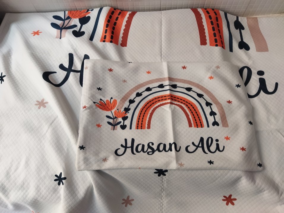 Çok renkli baskılı desenlere sahip, yumuşak sentetik kumaştan yapılmış ve "Hasan Al" ismiyle kişiselleştirilmiş çocuk yatak örtüsü ve yastık kılıfı İsimli ve lekesi olduğu için uygun fiyatlı