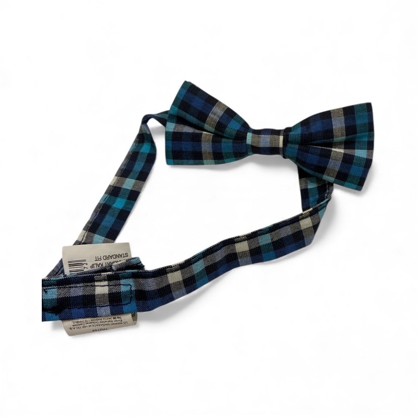 Çocuklar için koyu renkli çok renkli ekoseli desenli, sentetik kumaştan yapılmış papyon, sokak tarzına uygun.