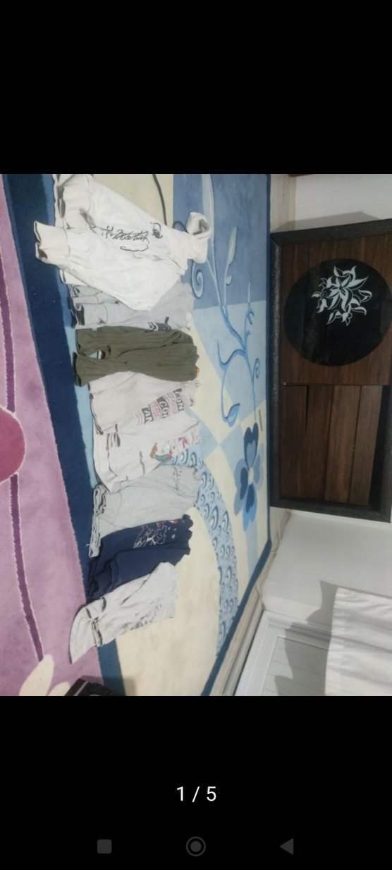 Çeşitli açık renkli üst ve pantolonların yer aldığı çok renkli çocuk kıyafetleri seti. karışık marka