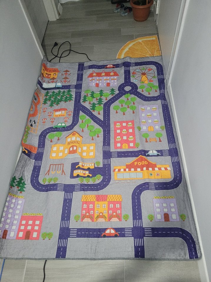 Çocuklar için gri zemin üzerinde yollar, binalar ve oyun alanları içeren çok renkli şehir haritası desenli halı. ️