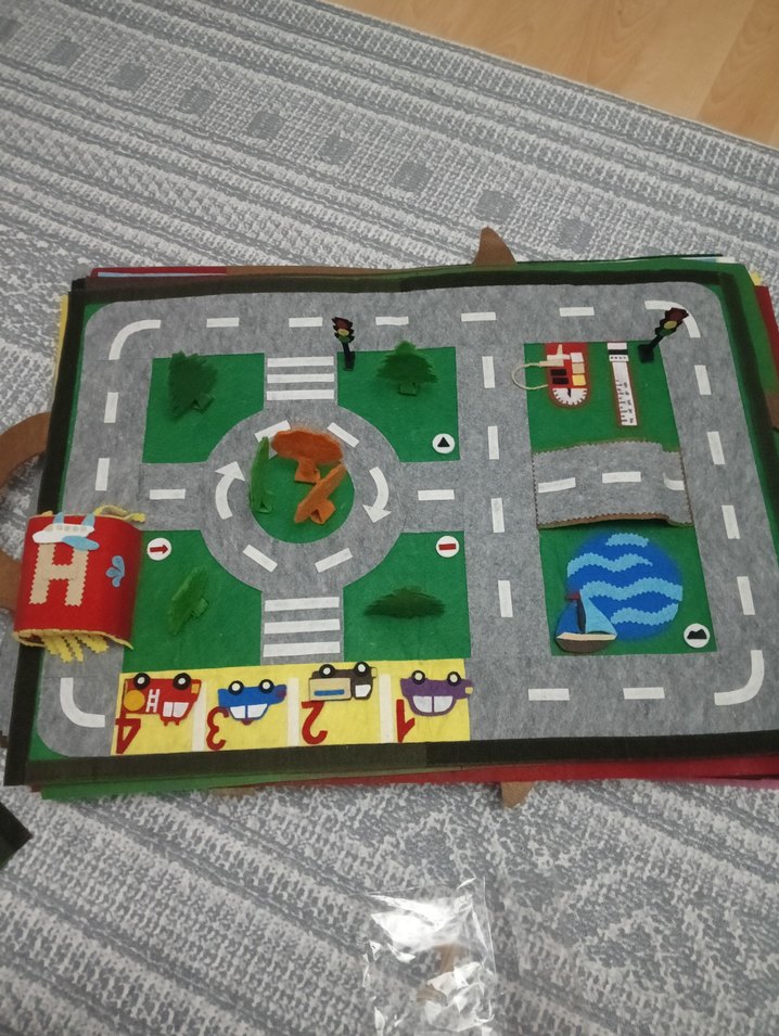 Bu çocuk oyun matı, yumuşak gri zemin üzerinde çok renkli yol ve park tasarımı sunar; yuvarlak kavşak ve küçük araçlar gibi etkileşimli öğeler içerir. Tamamen doğal, keçeden yapılmış, çanta haline de geliyor, 70-50 ebatında. Yeni ürün