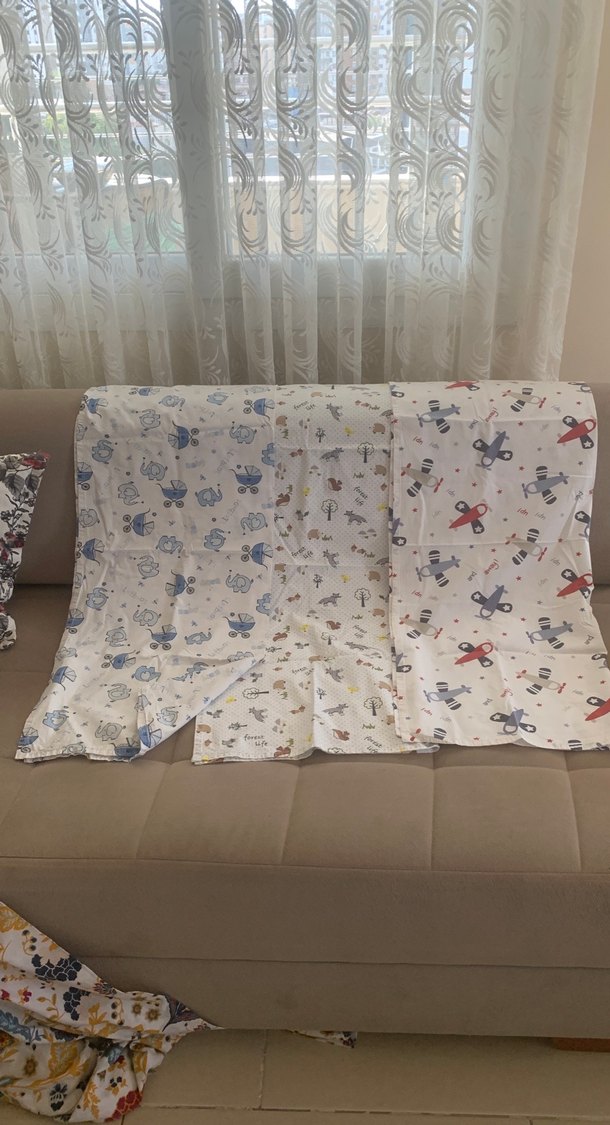 Çocuklar için hafif renkli, oyunlu baskılı desenlere sahip yumuşak pamuklu kumaştan dikilmiş örtü Ölçüsü 85x70 cm koltuğun üstünde uyuyacağında seriyorduk üç ad özel diktirmiştik