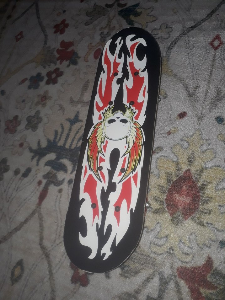 Çocuklar için koyu renkli, çok renkli ve alevli kanatlı kafatası desenli scooter. kaykay